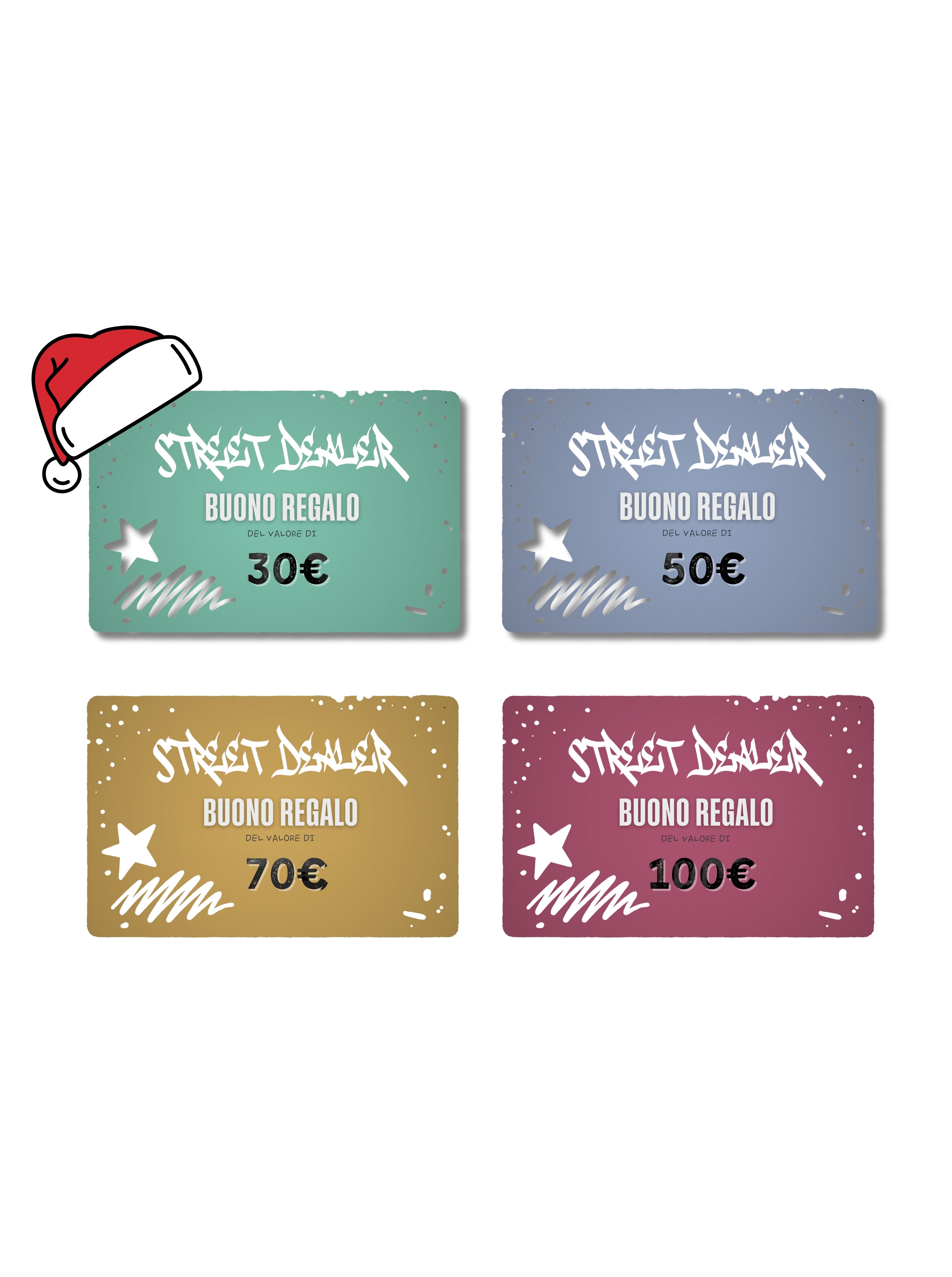 Disponibili in diversi tagli (30€, 50€, 70€, 100€, 150€), possono essere utilizzati sia online che nel nostro negozio fisico, per acquistare qualsiasi prodotto Street Dealer.